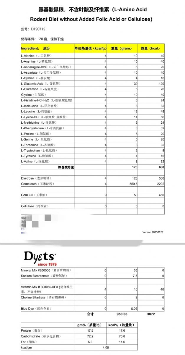 氨基酸鼠粮,不含叶酸及纤维素(L-Amino Acid Rodent Diet without Added Folic Acid or Cellulose),Dyets公司,货号:D190715