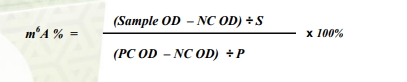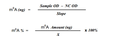绝对定量:使用精确的公式绝对定量计算 m6A 的量。首先,绘制标准曲线和OD值的斜率与在每个浓度点的PC的量。其次,使用线性回归绘制标准曲线(Microsoft Excel的线性回归函数适用于这样的计算)。使用最标准的线性回归(至少包含4个浓度点)绘制斜率。现在,使用如下的公式计算总RNA中 m6A 的量和百分比。
