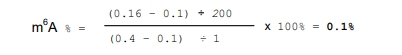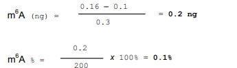 相对定量:确定二份不同样本RNA中相对定量的 m6A RNA 甲基化状态,采用如下的公式简单计算总RNA中 m6A 的百分比。